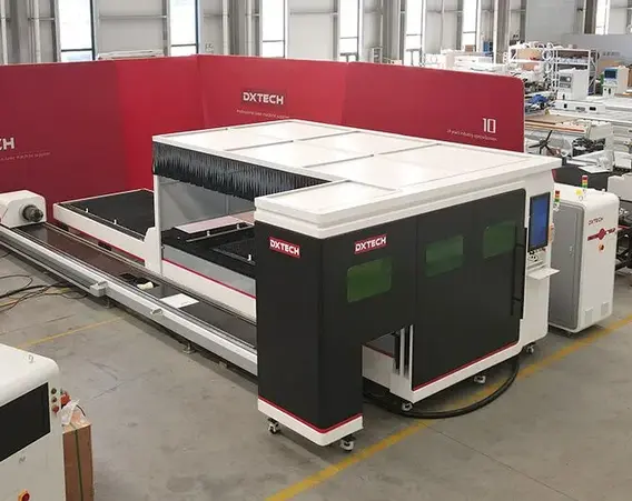DXTECH SLT, tamamen kapalı koruyucu kapağı ile katı çevre koruma standartlarını karşılayan ve kullanıcı güvenliğini ön planda tutan fiber lazer kesim makinesidir.